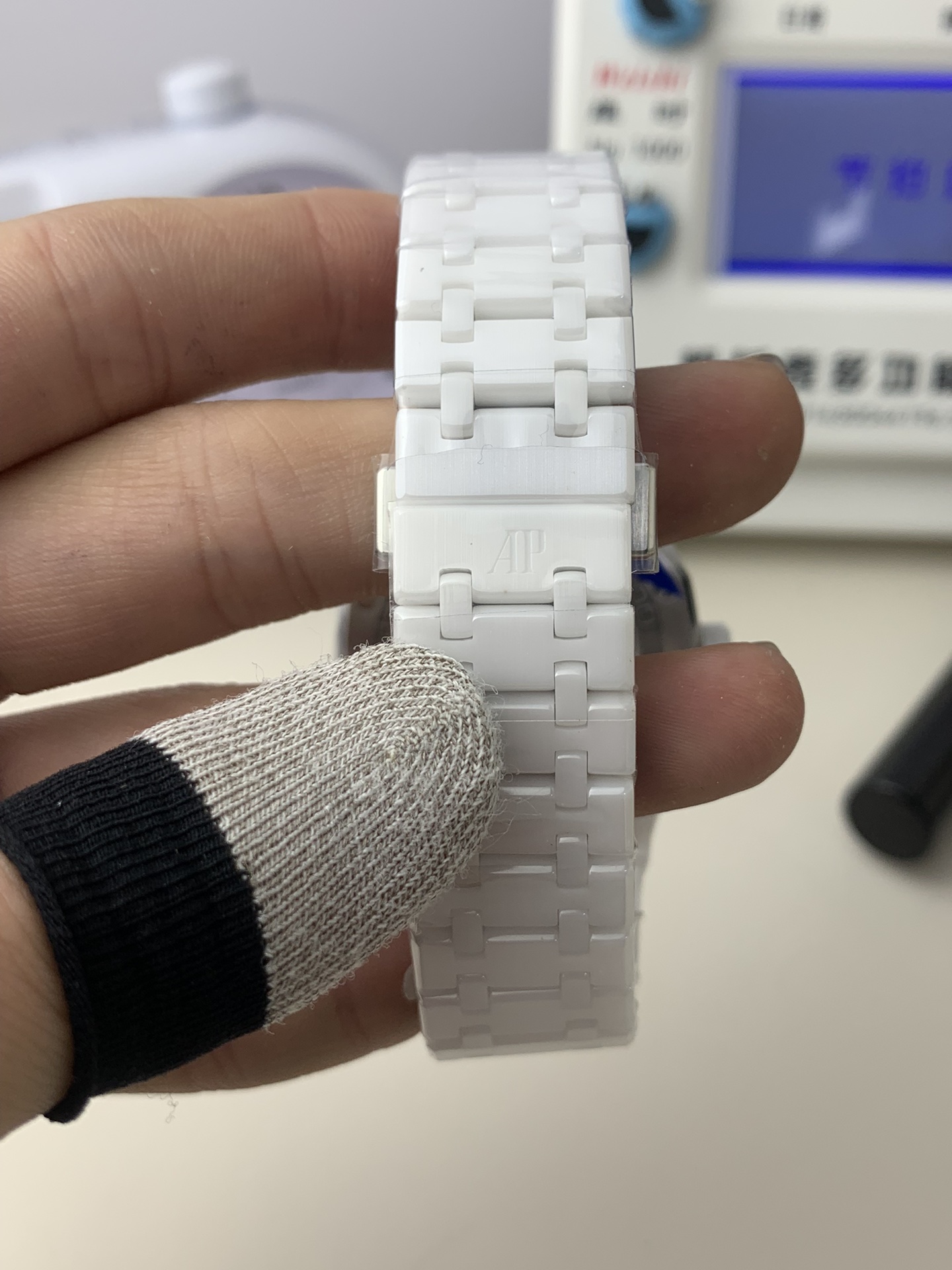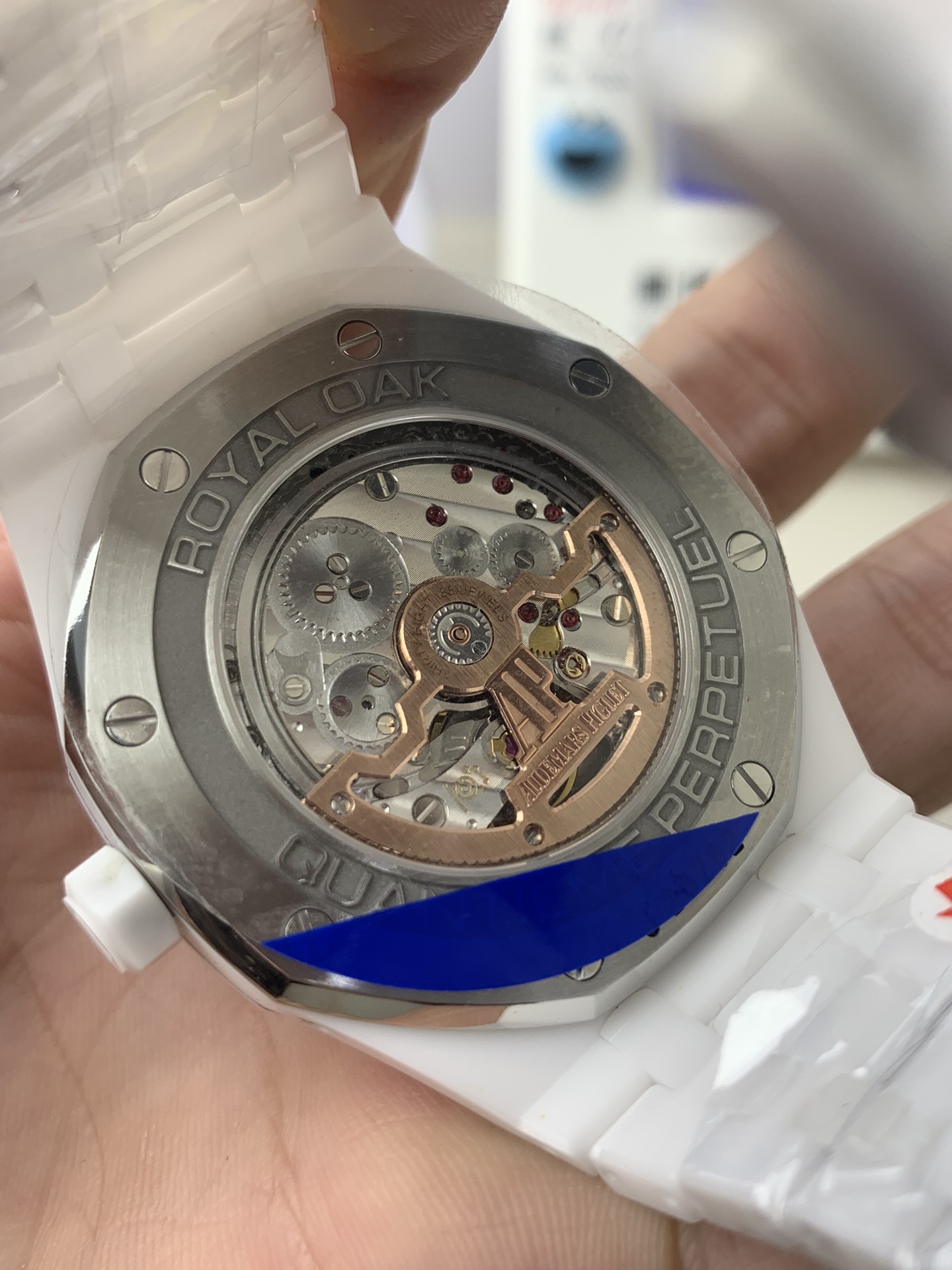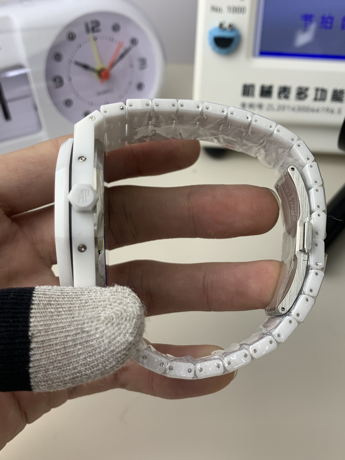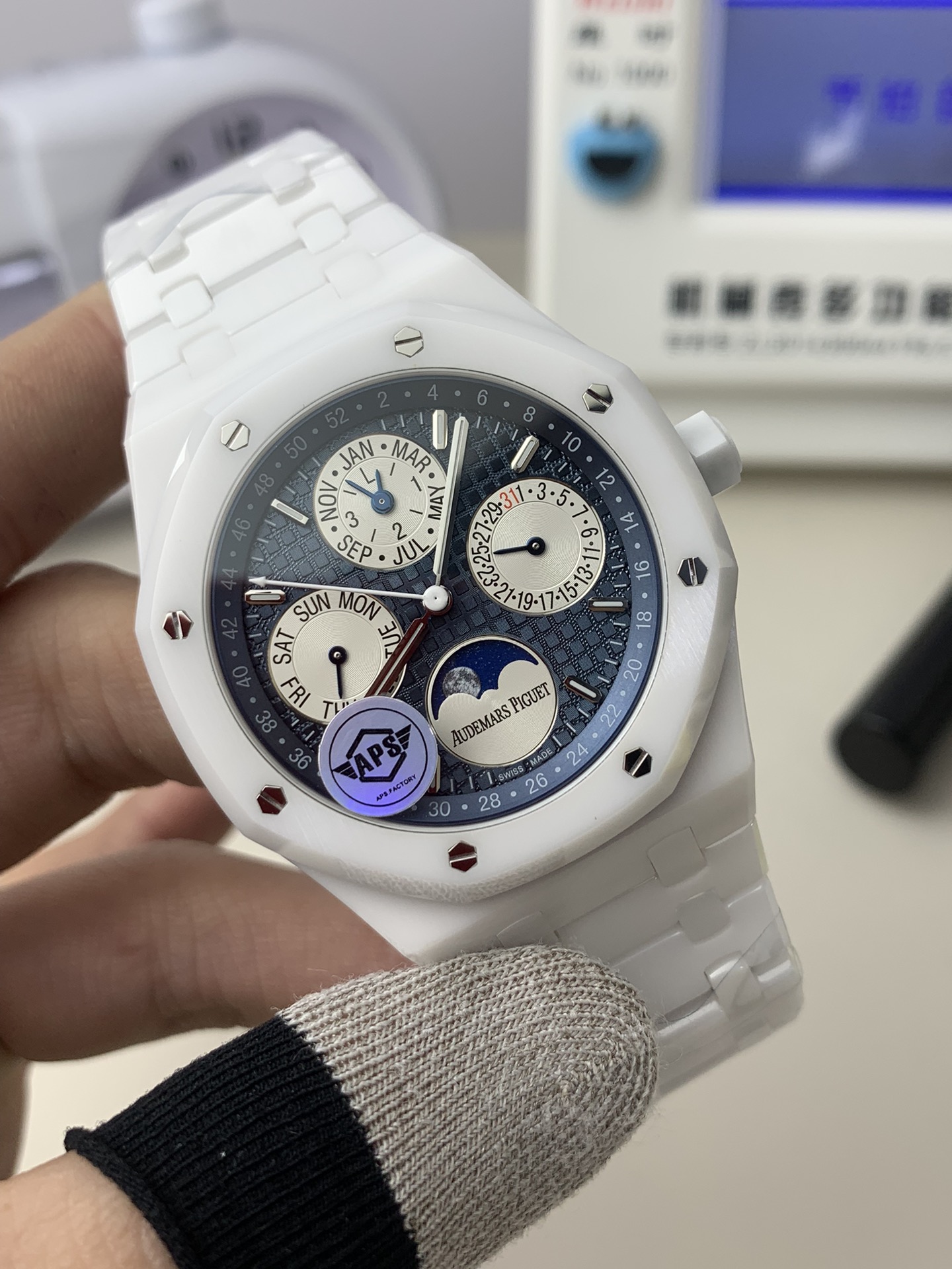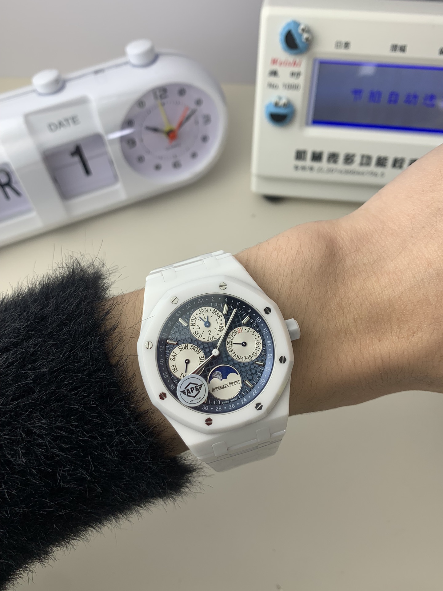 Audemars Piguet White Ceramic 26579 Authentic Moon Phase Royal Oak Series Features a “Grande Tapisserie” large checkered pattern dial. Date, day, month, moon phase, and four-eye positions align precisely with the original (distinguishing from standard versions where the four eyes are clustered together). Displays an astronomically accurate moon phase using a genuine lunar image, creating striking contrast. 41mm diameter. Features a replica integrated 5134 automatic winding movement, 10.5mm thick (distinct from standard market versions at 14mm). All functions are fully operational, offering a slimmer profile and enhanced authenticity!