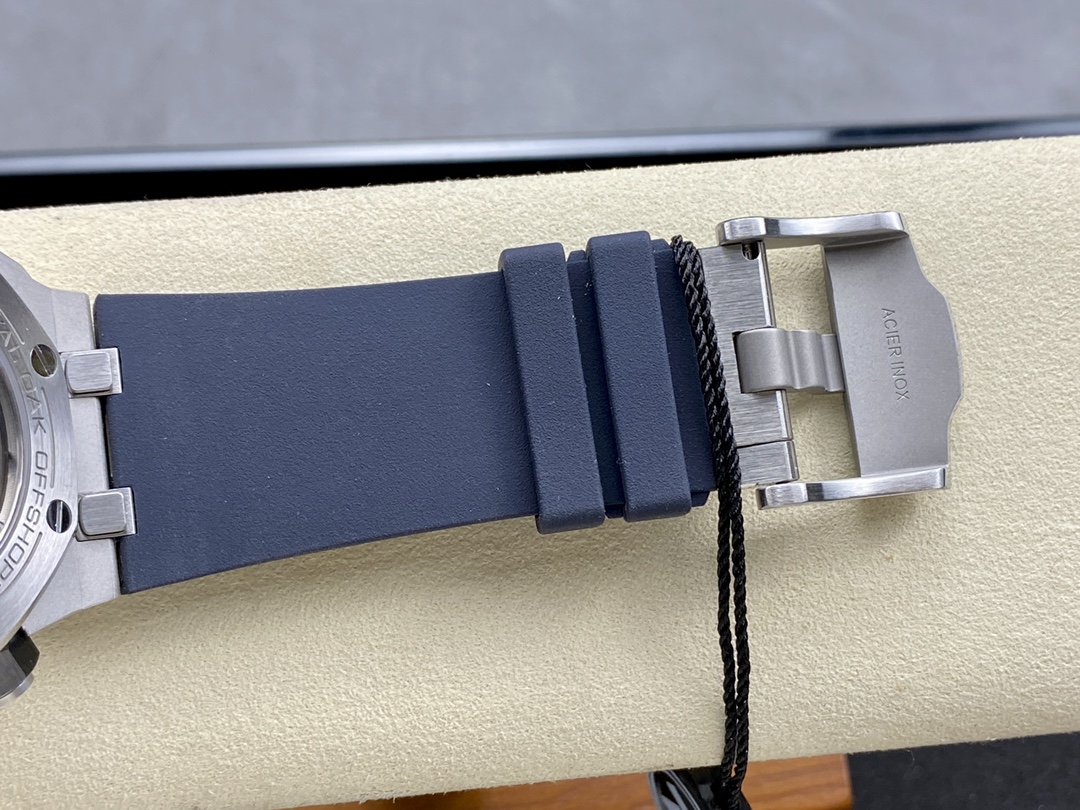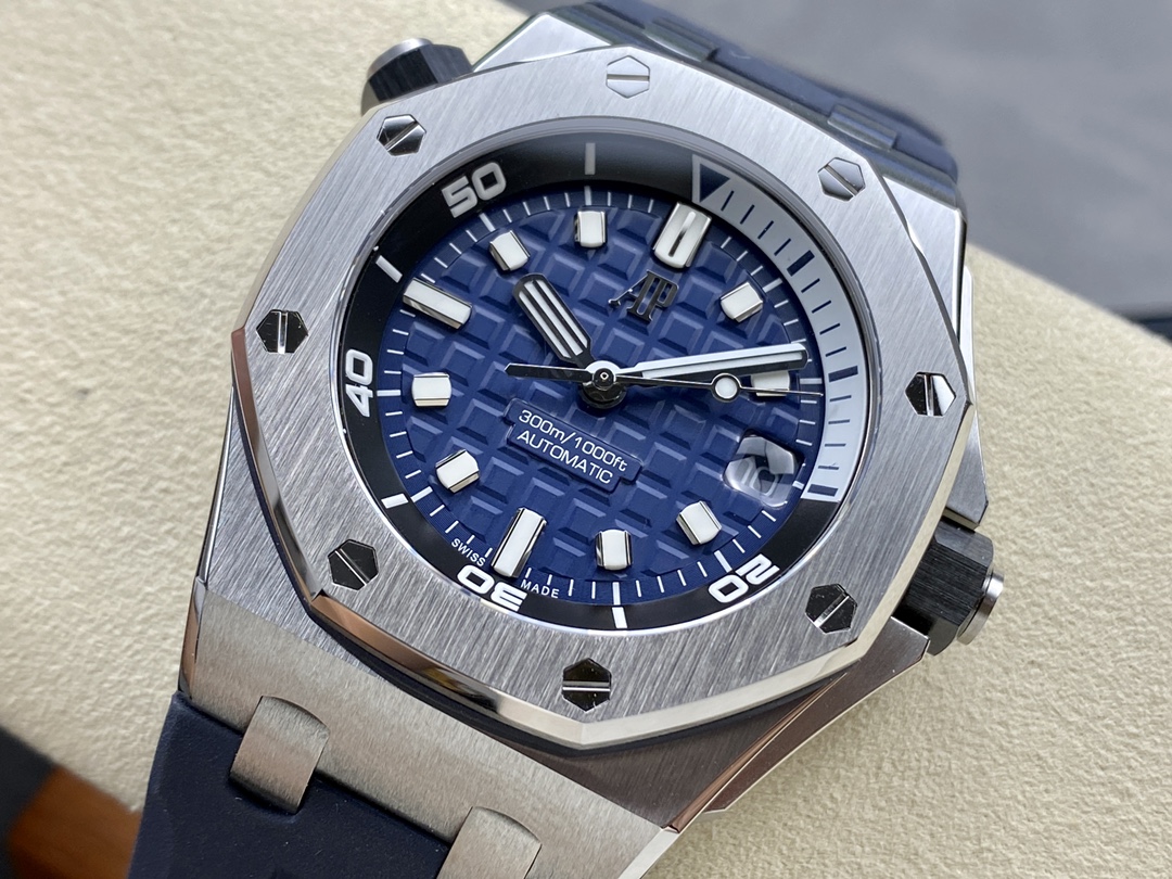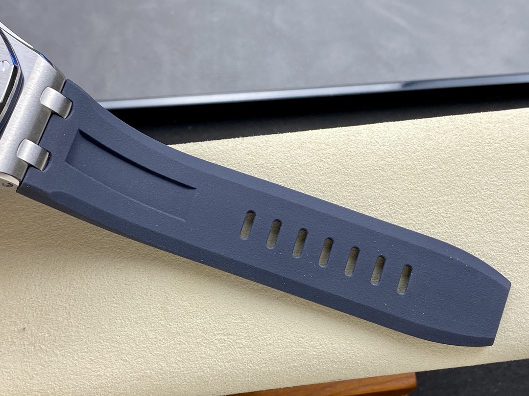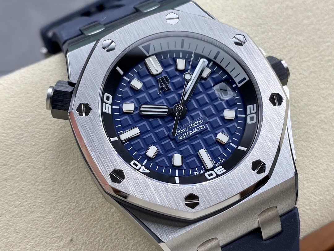 Audemars Piguet 15720! Watch dimensions: 42mm x 14.2mm. Stainless steel case paired with anti-reflective sapphire crystal glass on both the dial and case back. Black ceramic screw-down crown. All specifications and materials meticulously scanned and matched to the original. Powered by the market-exclusive Calibre 4308 automatic movement, ensuring stable timekeeping with no after-sales concerns. The movement's bridges feature enhanced finishing for greater dimensionality. Newly customized rotor color: most ergonomic active-head cushioning. Dial engraved with “Méga Tapisserie” large-scale guilloché decoration, paired with luminous 3D hour markers and Royal Oak hands. Black rotating inner bezel with beige 0-15 minute zone. Imported luminous filling ensures the most enduring night visibility and perfectly aligned inner scale. Magnifier calendar window with consistent magnification. Removable strap with exceptional transparency uses the latest imported rubber material, delivering seamless sporty style. ZF's irresistible charm awaits!