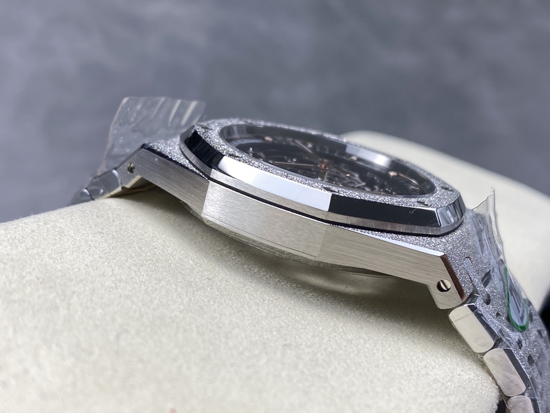 The V2 version upgrades the hands and rear rotor plate. The most eye-catching feature of the 15407 is undoubtedly the balance wheel and balance cock at the 8 o'clock position. THB's newly customized genuine balance wheel boasts a dazzling golden effect that never grows tiresome. As the balance wheel rotates, each gear operates in perfect order, showcasing undeniable mechanical beauty. Upon closer inspection, the meticulous finishing of each gear bridge reveals the uniquely captivating craftsmanship of high-end watchmaking.