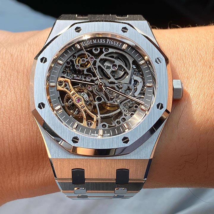 Slate grey openworked dial, pink gold applied hour-markers and Royal Oak hands with luminescent coating.