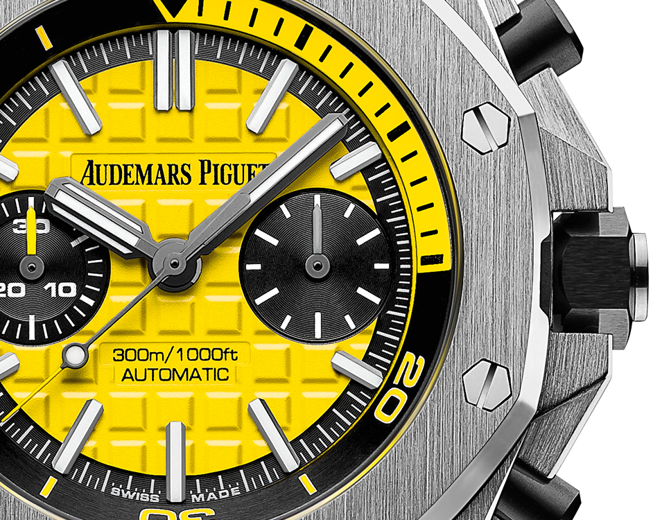 Yellow dial with “Méga Tapisserie” pattern, black counters, blackened gold applied hour-markers and Royal Oak hands with luminescent coating, black rotating inner bezel with diving scale and zone from 60 to 15 minutes in yellow.
