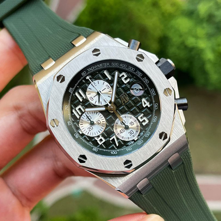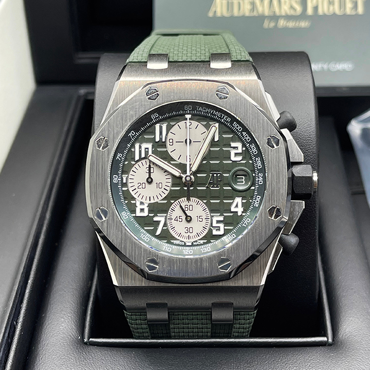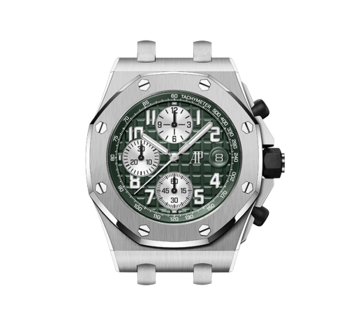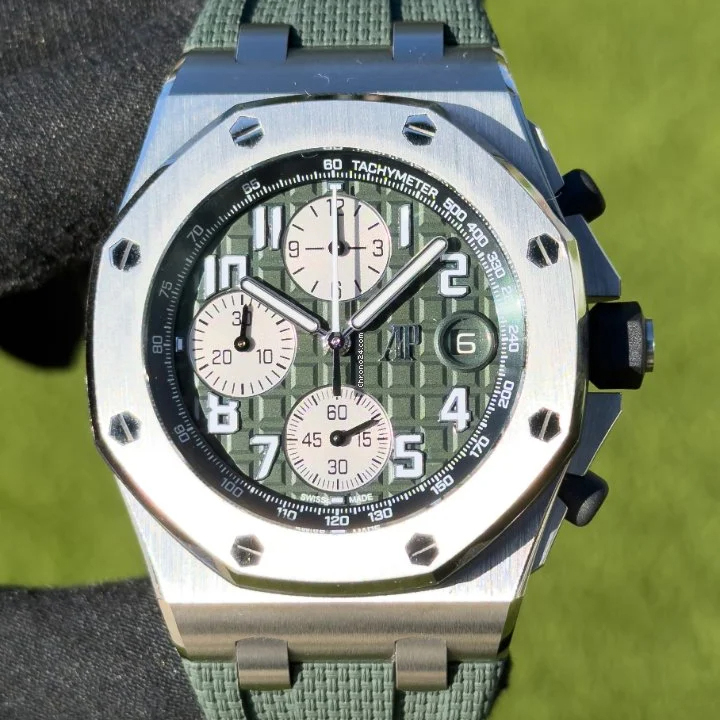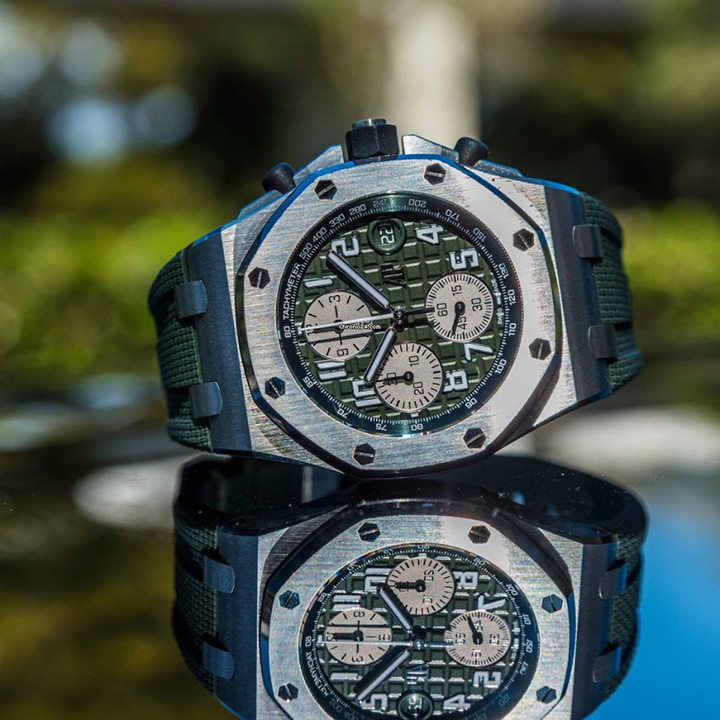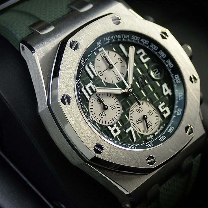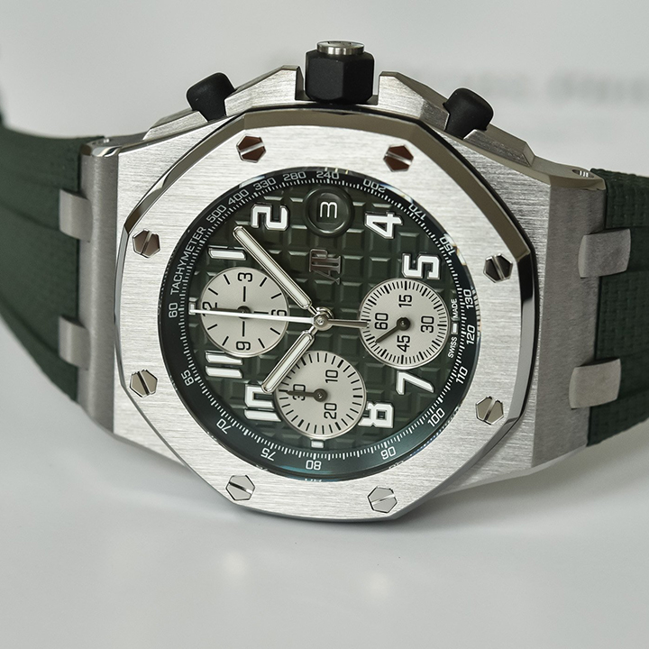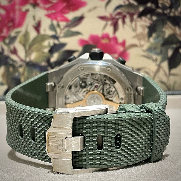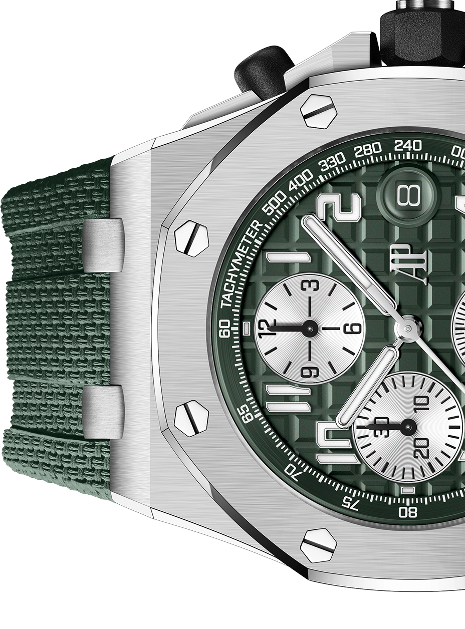 Khaki green dial with “Mega Tapisserie” pattern, silver-toned counters, arabic numerals hour-markers and white gold Royal Oak hands with luminescent coating, khaki green inner bezel.