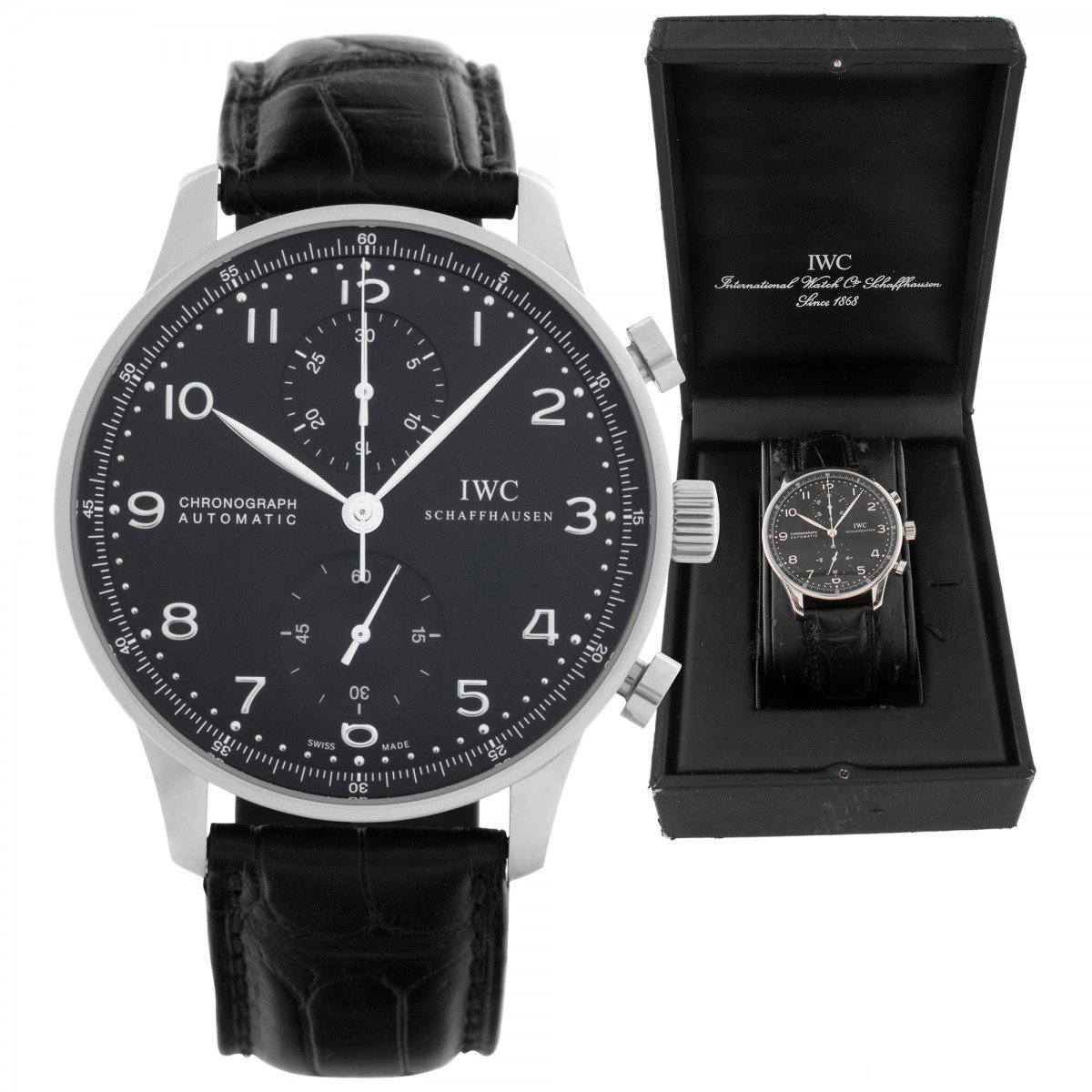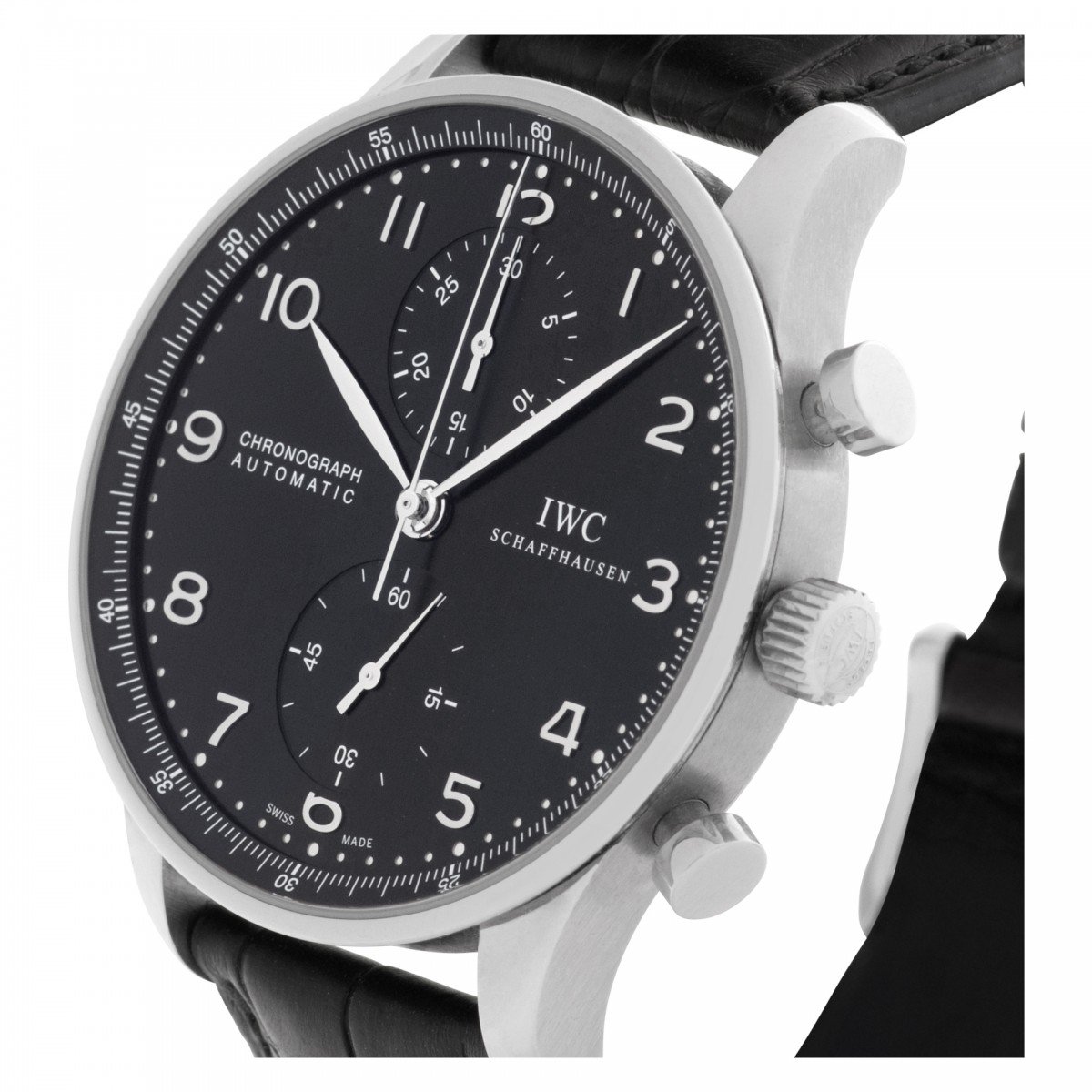 Silver-tone stainless steel case with black alligator leather strap. Fixed silver-tone stainless steel bezel. Black dial with silver-tone leaf-shaped hands and Arabic numerals. Minute markers around outer rim.