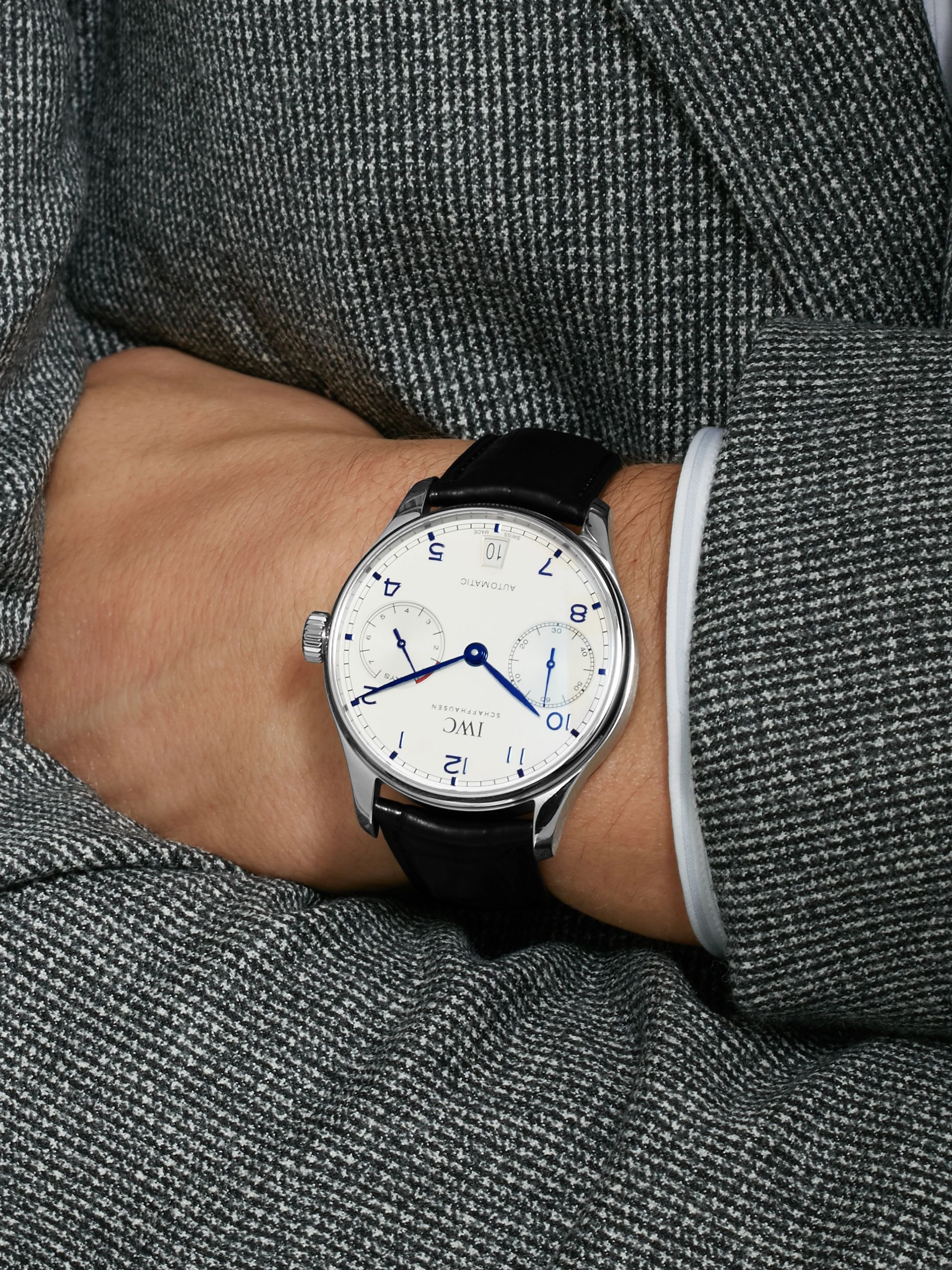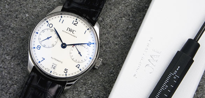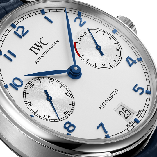 Showcasing the high-quality craftsmanship for which IWC Schaffhausen is known, the Portugieser reflects a long tradition of Swiss watchmaking. It is recognized globally for hallmark designs including a large case, Arabic numeral markers and a symmetric dial.