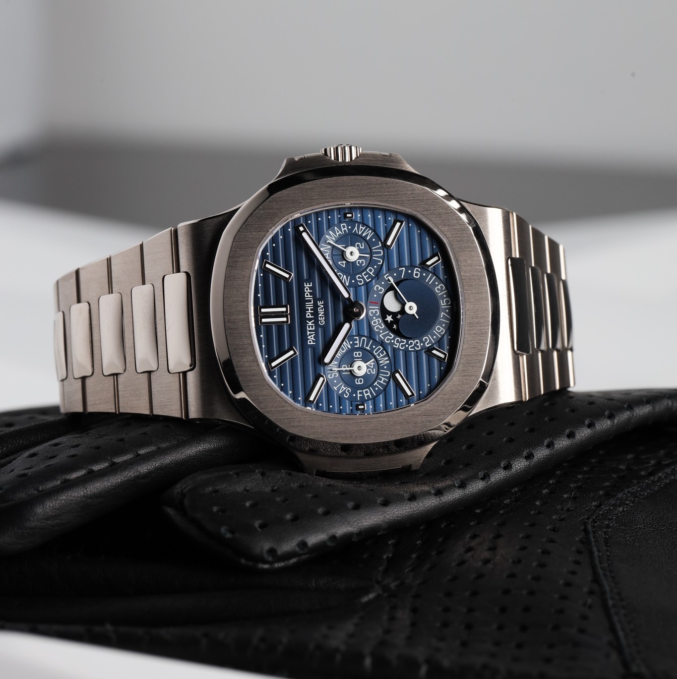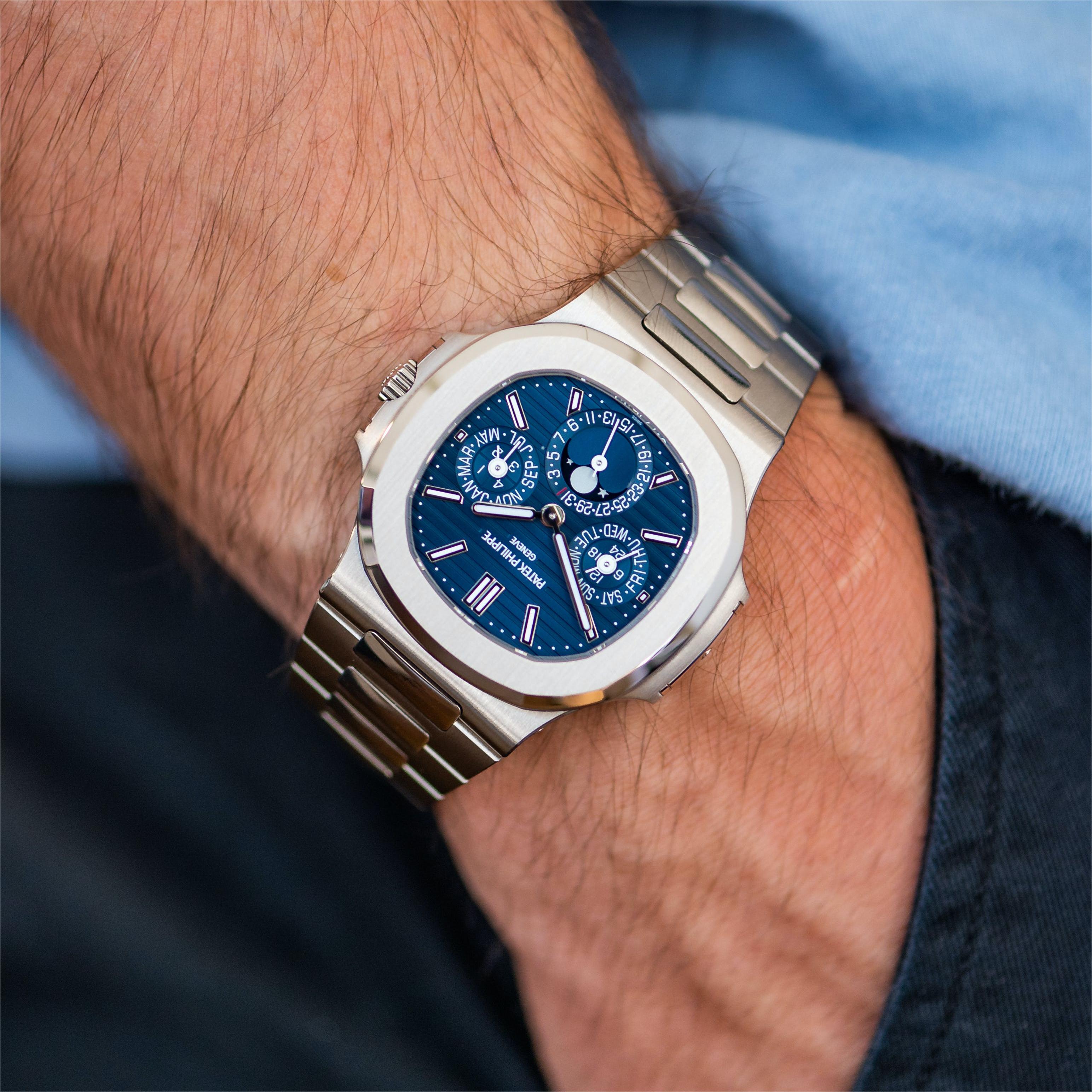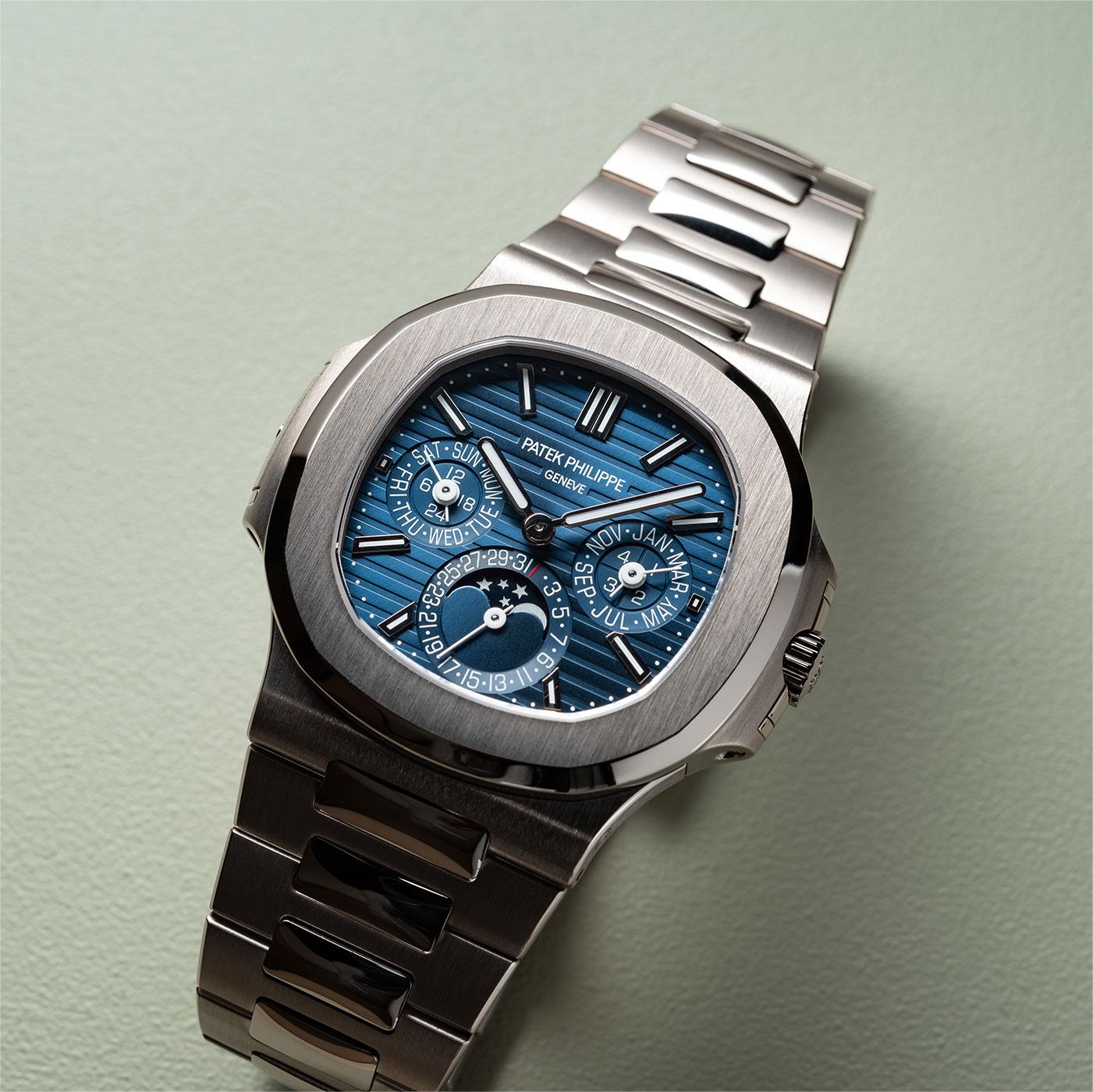 The first Grand Complication in the Nautilus collection, the Reference 5740/1 Nautilus perpetual calendar, offers a distinctive blend of sports appeal and technical sophistication. Thanks to the famous ultra-thin self-winding caliber 240 Q movement, the case (water resistant to 60 m) is remarkably svelte, making this watch Patek Philippe’s thinnest perpetual calendar. The bracelet is equipped with a new fold-over clasp providing optimized security.