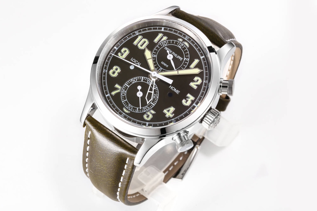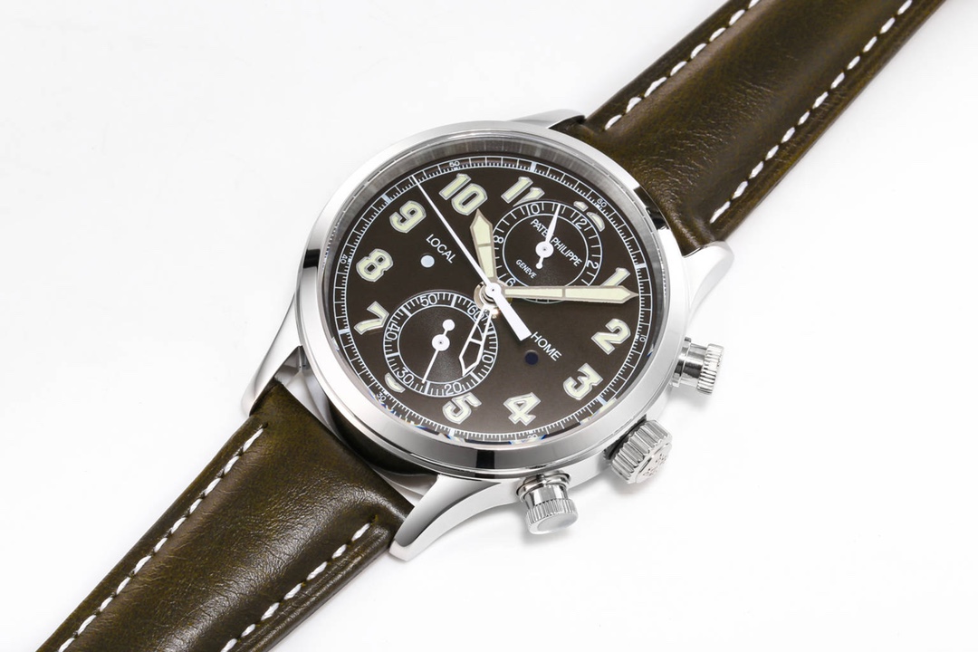 Case: Crafted from 18K white gold, with a 42mm diameter and 13.05mm thickness, featuring a mirror-polished finish. Two vintage-style piston pushers on the right side operate the chronograph function, while two concealed pushers on the left side allow for bidirectional adjustment of the second time zone hand in 1-hour increments.