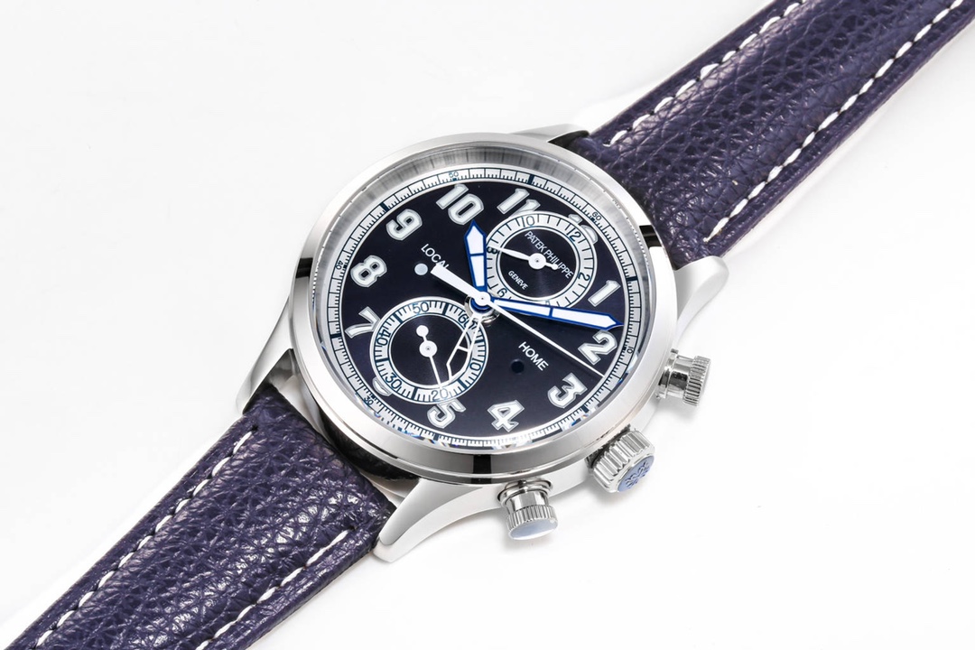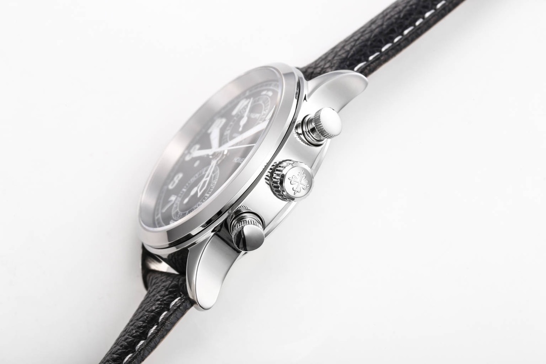 Case: Crafted from 18K white gold, with a 42mm diameter and 13.05mm thickness, featuring a mirror-polished finish. Two vintage-style piston pushers on the right side operate the chronograph function, while two concealed pushers on the left side allow for bidirectional adjustment of the second time zone hand in 1-hour increments.