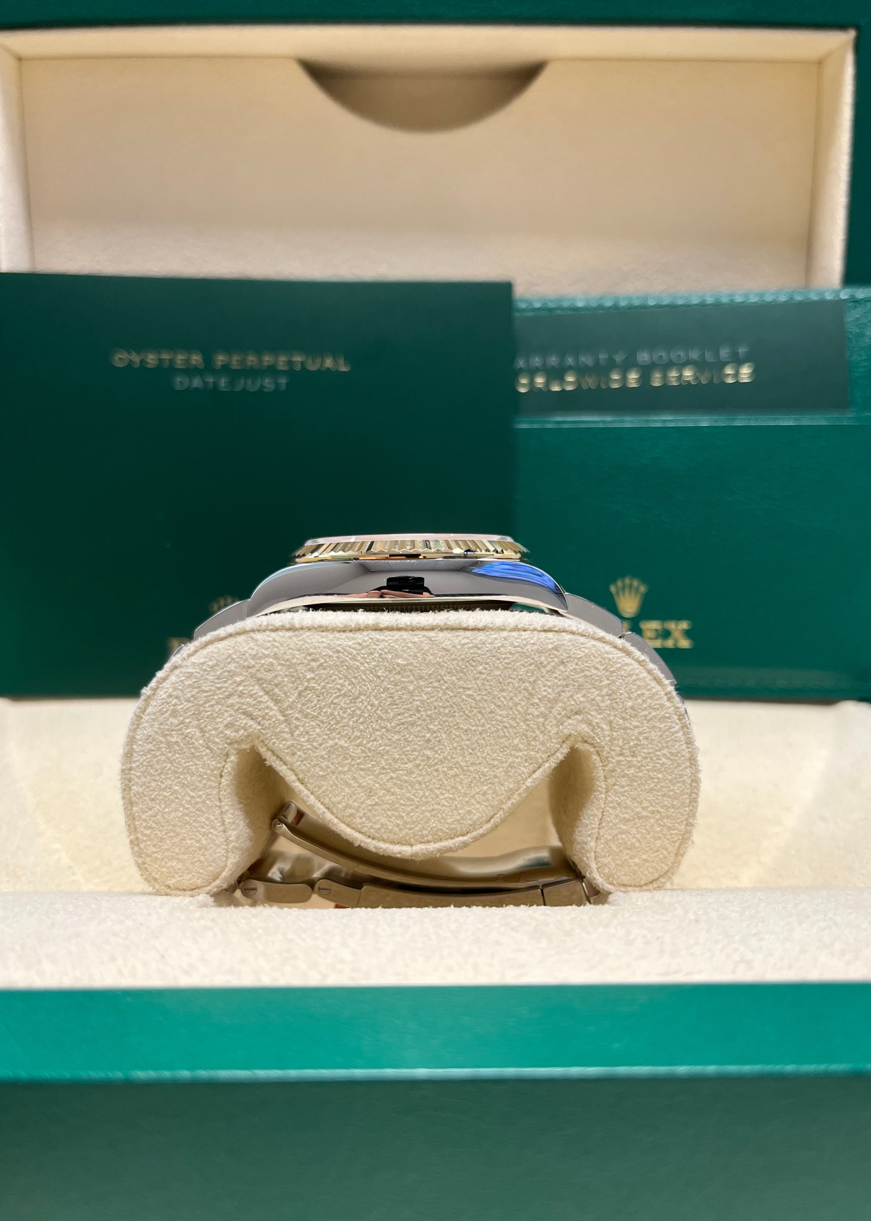36mm Yellow Rolesor case with 904L steel monobloc middle case, screw-down steel back, 18K yellow gold screw-down crown, 18K yellow gold fluted bezel, scratch-resistant double anti-reflective sapphire crystal with cyclops lens over the date, golden fluted motif dial, index hour markers, Rolex calibre 3235 perpetual self-winding movement with date at 3 o'clock that changes instantaneously at midnight in a few thousandths of a second, approximately 70 hours of power reserve, yellow Rolesor Oyster bracelet made from a combination of 904L steel and 18K yellow gold with flat three-piece links, folding Oysterclasp buckle with Easylink 5mm comfort extension link. Waterproof to 100 meters.?