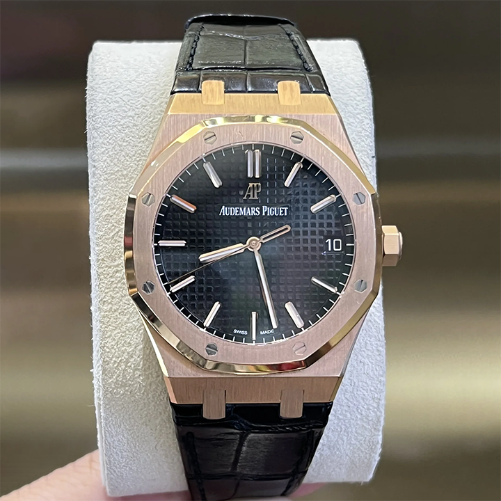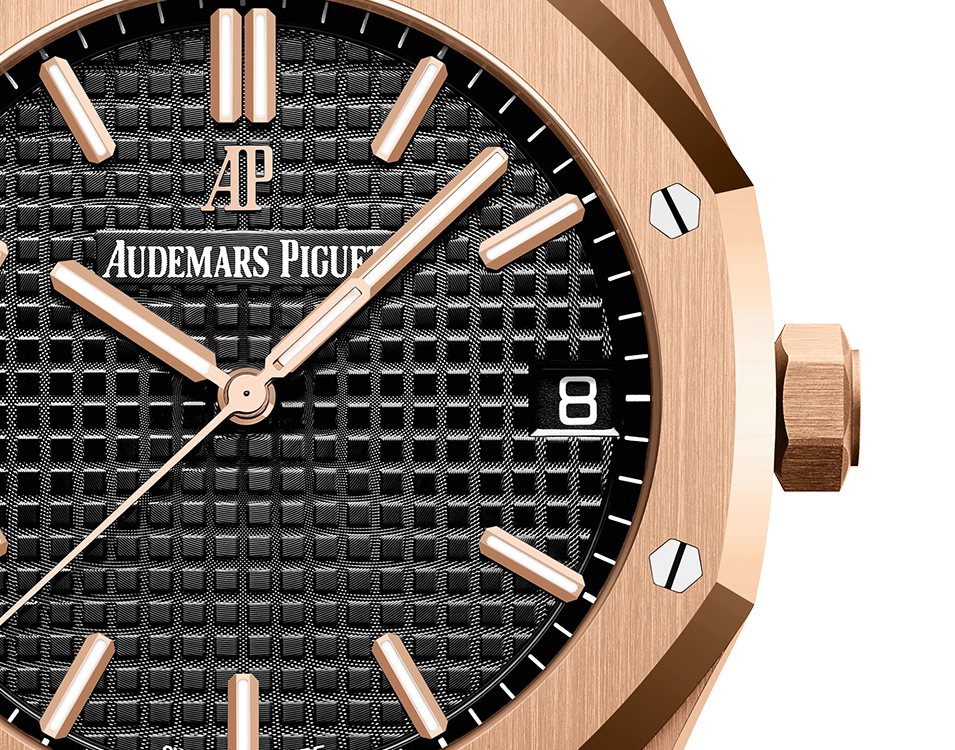 Black dial with “Grande Tapisserie” pattern, pink gold applied hour-markers and Royal Oak hands with luminescent coating.