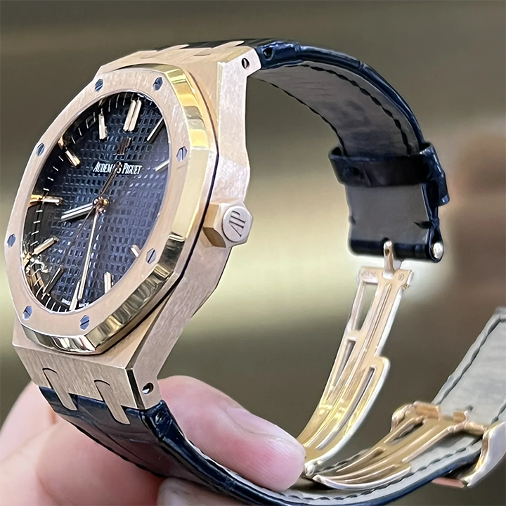 This pink gold Selfwinding Royal Oak with alligator strap offers new details: wider indexes, a minute train printed on the external area, and a date window further away from the centre.