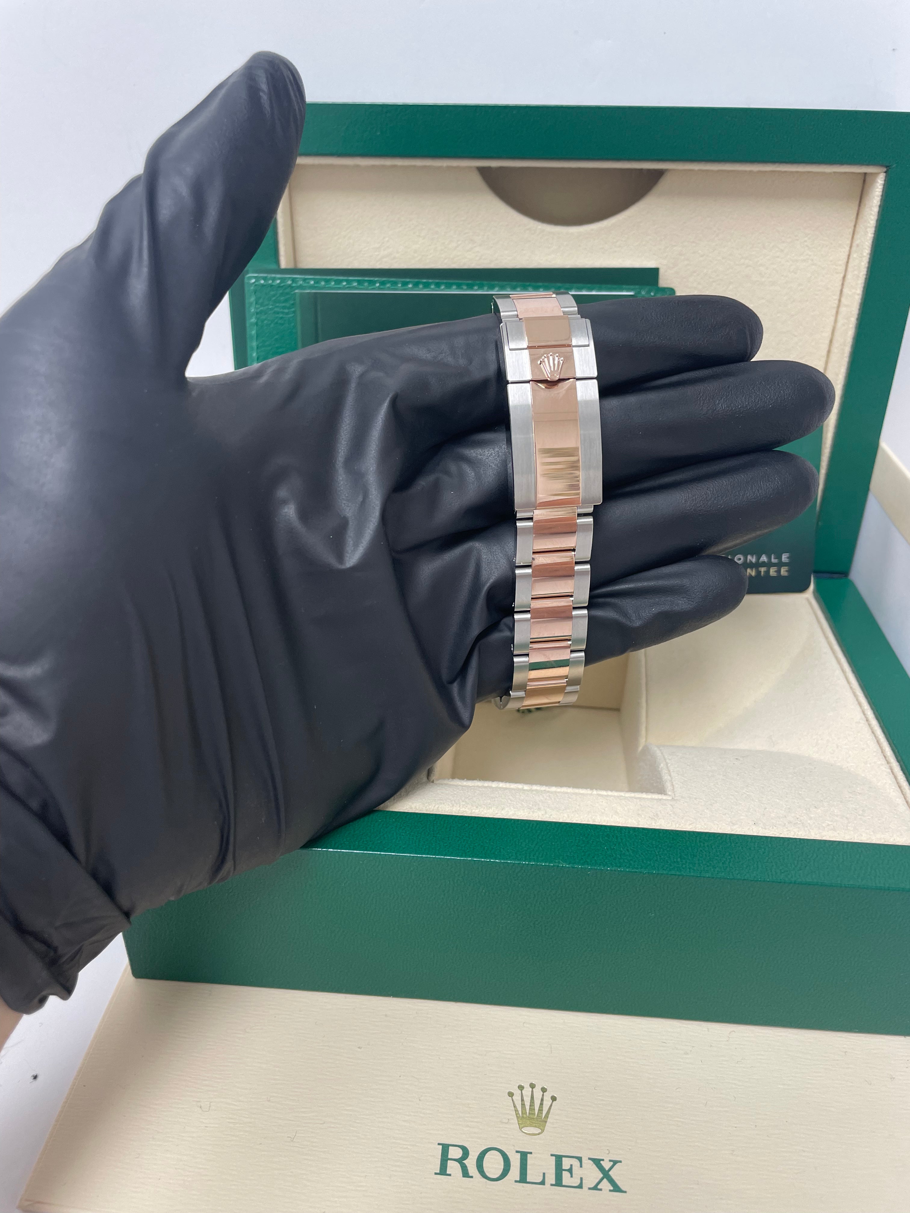 40mm Everose Rolesor case comprised of a 904L steel monobloc middle case, screw-down steel back, screw-down Everose gold crown with triplock double waterproofness system, bidirectional rotatable 18K Everose gold bezel with polished raised numerals and graduations, scratch-resistant sapphire crystal with cyclops lens over the date and double anti-reflective coating, black dial, pink gold applied hour markers with Chromalight blue luminescence, Rolex calibre 3135 automatic movement, approximately 48 hours of power reserve, Everose Rolesor Oyster bracelet comprised of a combination of 904L steel and 18K Everose gold in flat three-piece links, Oysterlock folding safety buckle with Easylink 5mm comfort extension link. Waterproof to 100 meters. Introduced at Baselworld 2016.