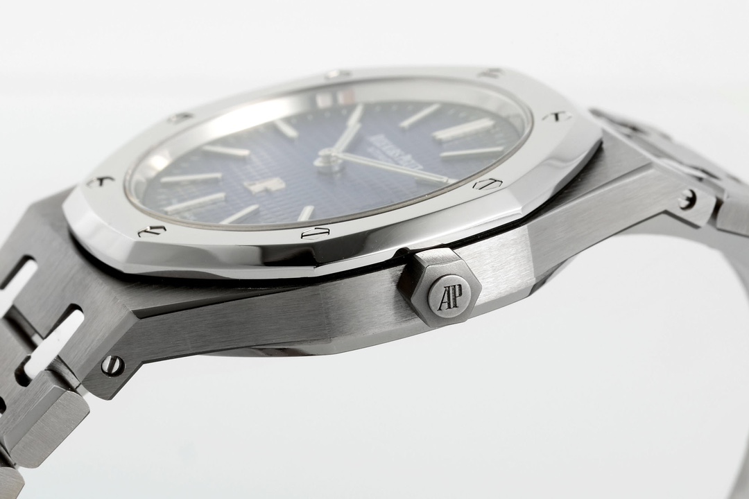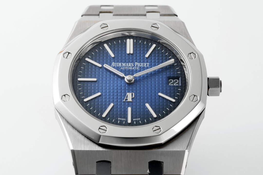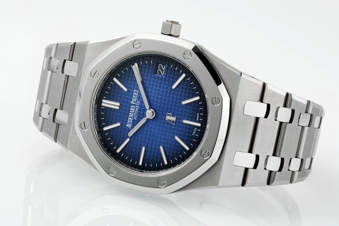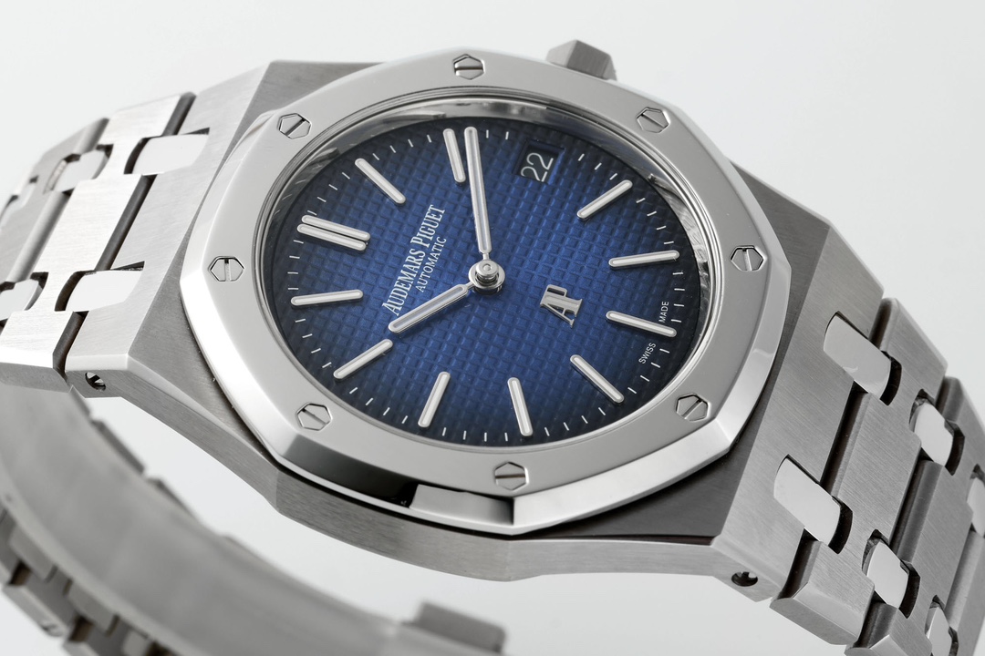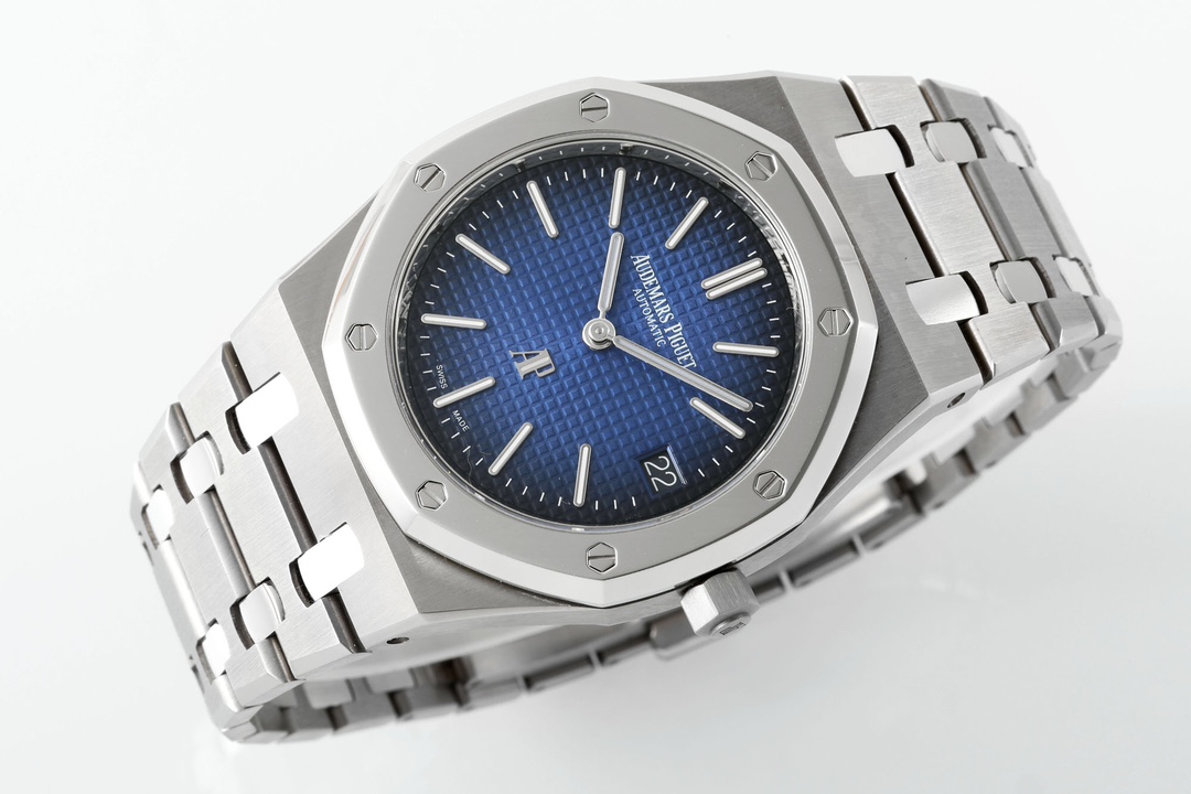 The dial retains the iconic Petite Tapisserie pattern, with Audemars Piguet introducing a stunning gradient effect on this Royal Oak Jumbo 15202IP: a vibrant blue at the center gradually deepens to black toward the outer edge. The dial's color is deep and steadfast, as profound as the ocean. The “cookie pattern” texture is three-dimensional, natural, and angular, with exceptionally fine micro-grooves. The vibrant dial creates a striking contrast with the polished bezel surface.