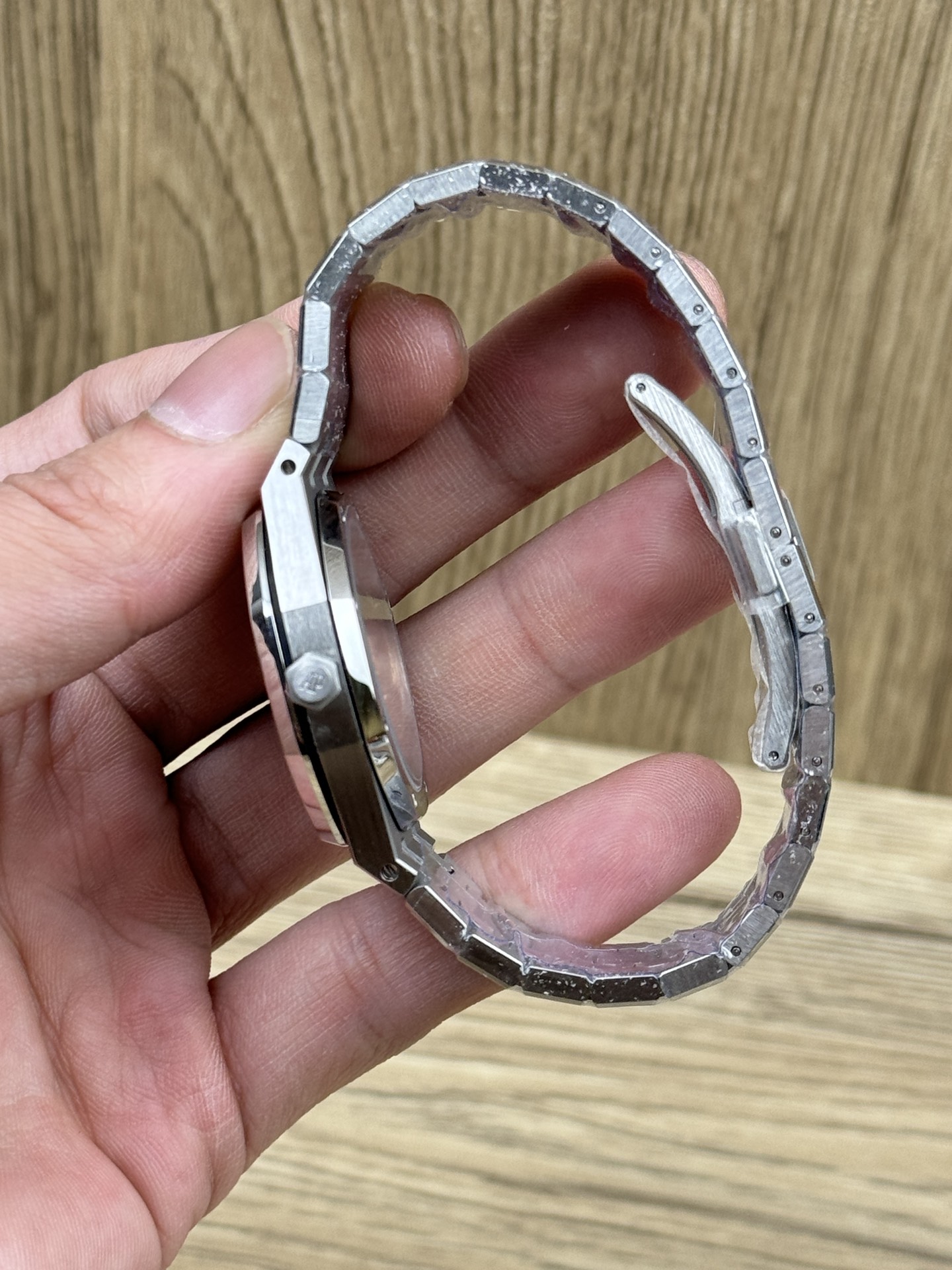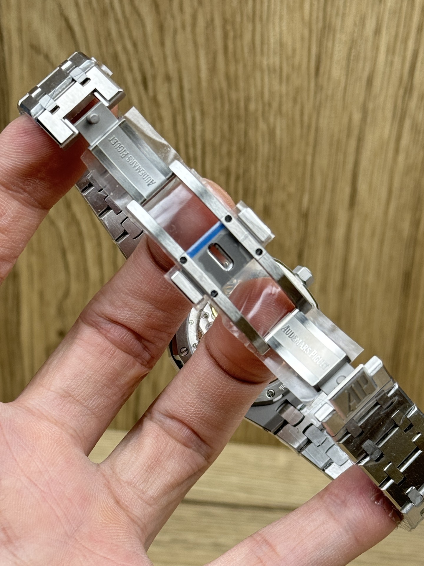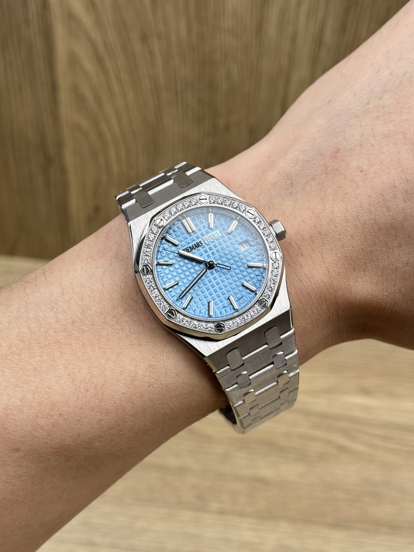 Dial: The iconic “Grand Guilloché” ice-blue dial features three-dimensional steel baton hour markers and hands. A date window is positioned at 3 o'clock, while the dial's edge bears embossed “AP” lettering. The overall palette is fresh and soft, with the combination of diamonds and metal lending an elegant, luxurious feel to this sporty design.