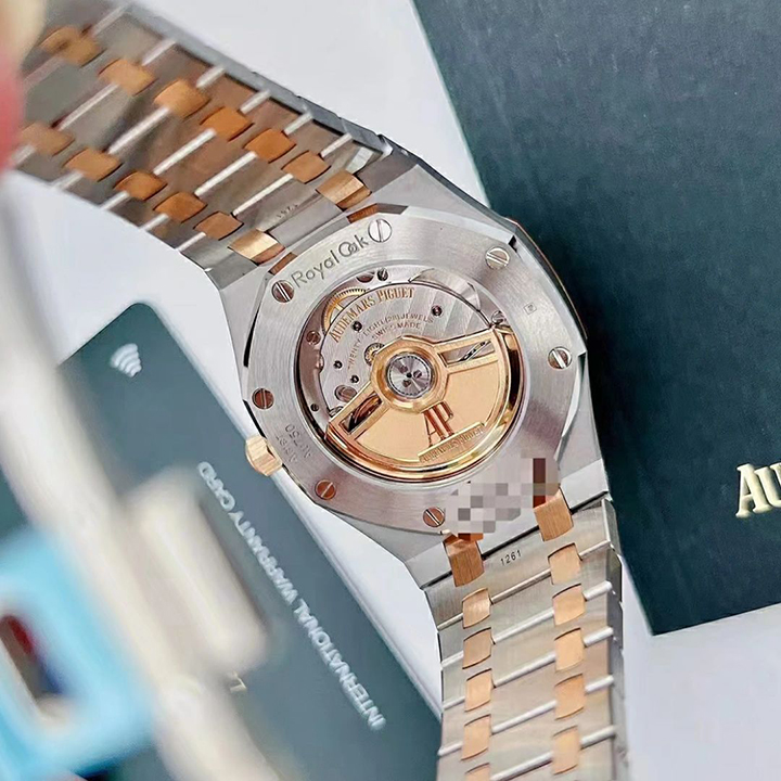 Silver-toned dial with “Grande Tapisserie” pattern, pink gold applied hour-markers and Royal Oak hands with luminescent coating.