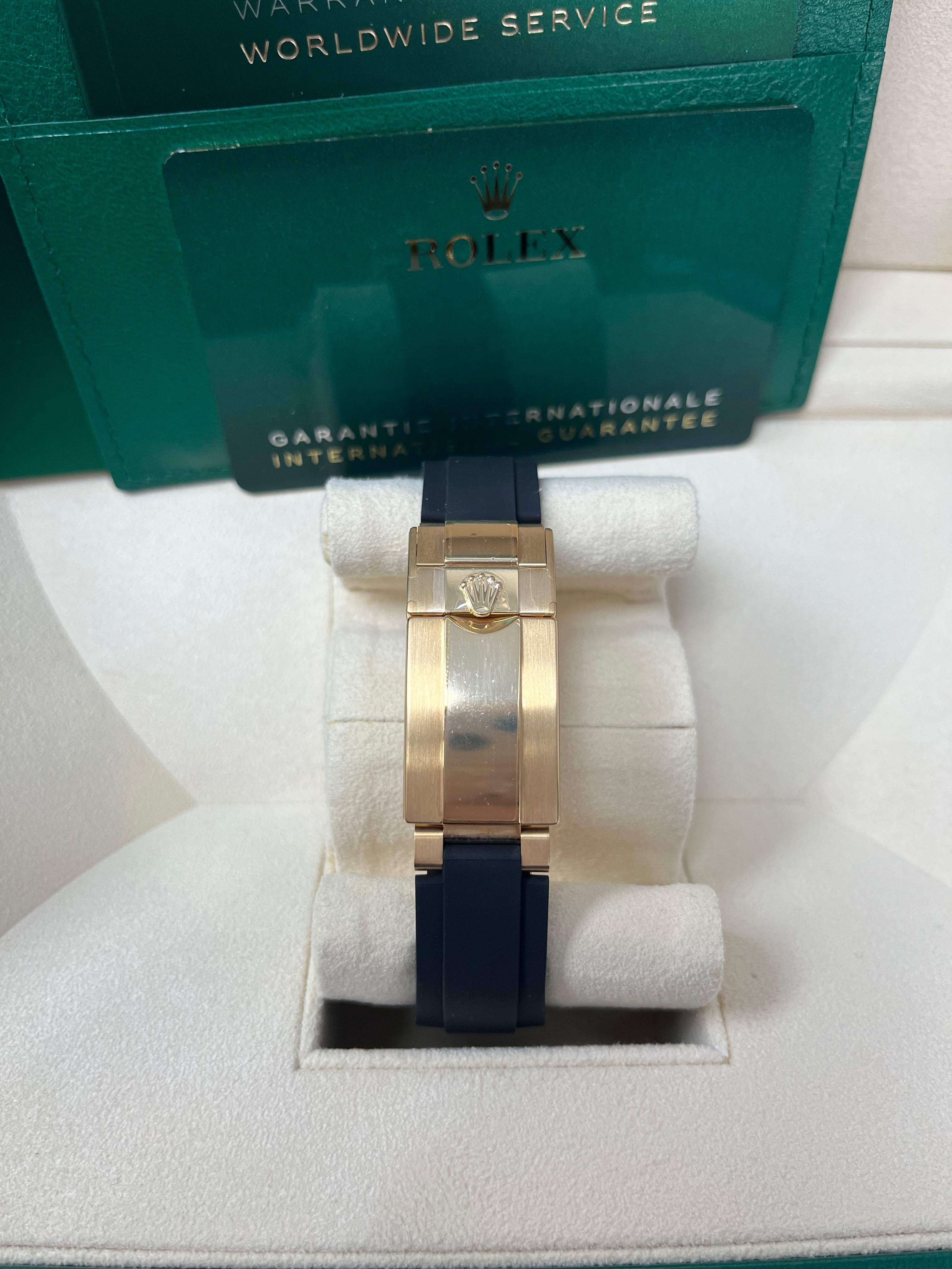 40mm 18K yellow gold case, screw-down yellow gold back, screw-down crown and push buttons with Triplock triple waterproofness, black monobloc Cerachrom bezel with engraved tachymetric scale, scratch-resistant double anti-reflective sapphire crystal, meteorite dial, black subdials, index hour markers, Rolex calibre 4130 perpetual self-winding movement with chronograph central second hand, 30-minute counter at 3 o'clock, and 12-hour counter at 9 o'clock, approximately 72 hours of power reserve, black Oysterflex strap made from flexible metal blades overmoulded with high-performance elastomer, Oysterlock folding safety buckle with Easylink 5mm rapid extension system. Waterproof to 100 meters.