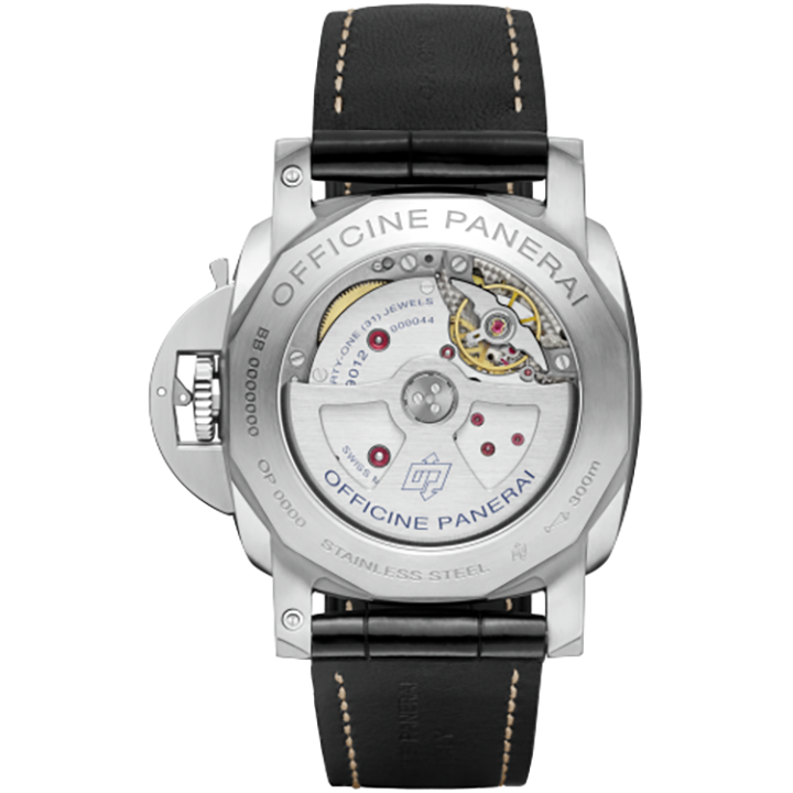 Automatic mechanical, P.9012 calibre, created by Panerai, 13¾ lignes, 6,0 mm thick, 31 jewels, Glucydur® balance, 28,800 alternations/hour. Incabloc® anti-shock device. Power reserve 3 days, two barrels, seconds reset device. 231 components