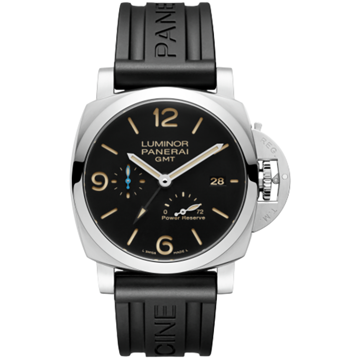 Black with luminous Arabic numerals and hour markers. Date at 3 o’clock, seconds at 9 o’clock, power reserve indicator at 5 o’clock.