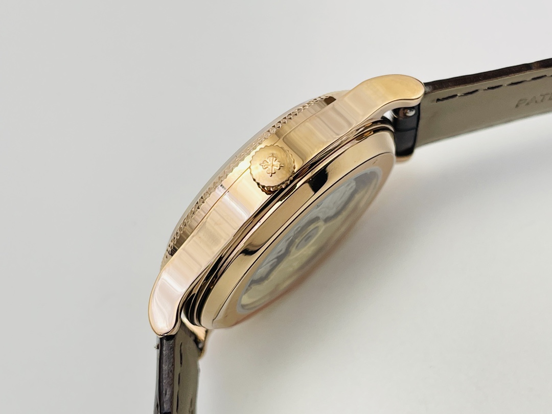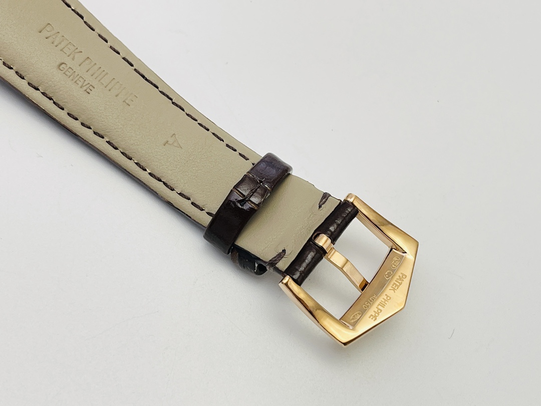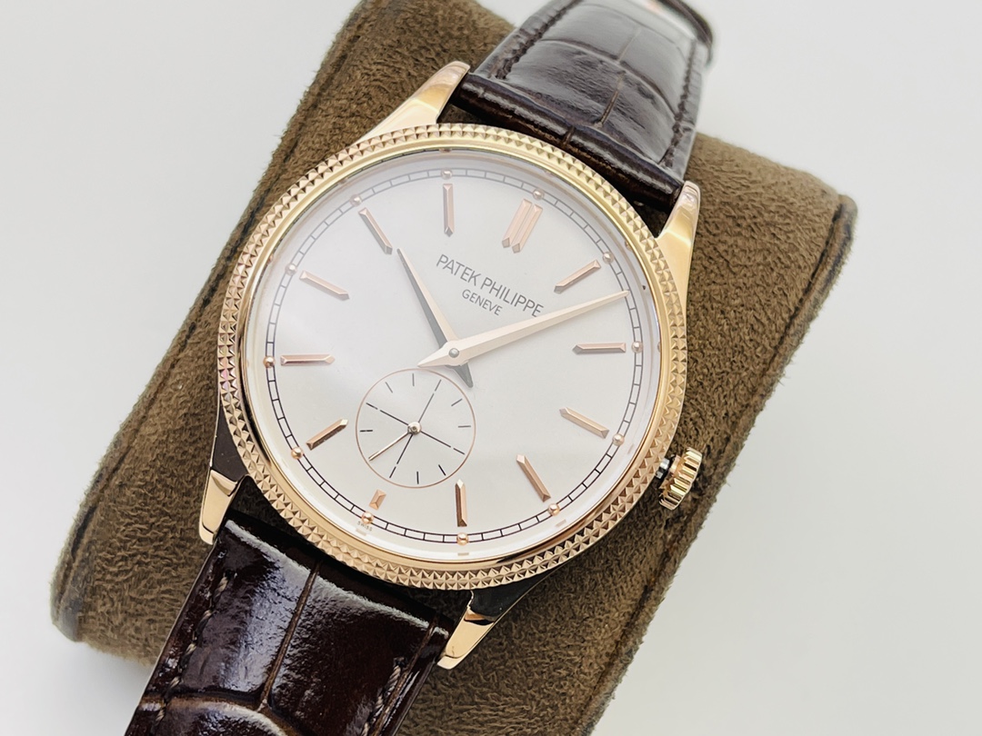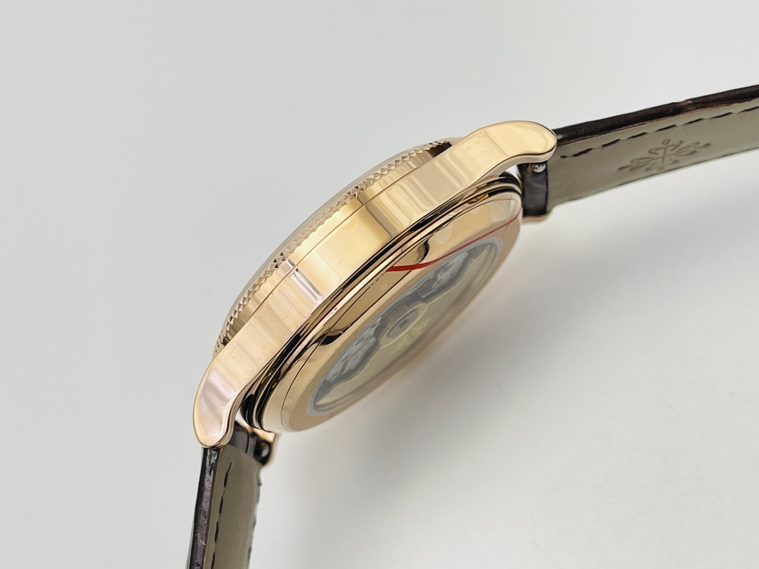 It features a 39mm 18K rose gold case, only 8.1mm thick, paired with a silver grained dial, exuding a warm and understated style. The round bezel is adorned with a hand-engraved Clous de Paris pattern, a classic design that first appeared in 1934, polished for a luxurious feel. The 18K rose gold faceted "bullet"-shaped hour markers are inspired by the most classic models in the Calatrava series. A double hour marker design at 12 o'clock, paired with 18K rose gold sword-shaped hour and minute hands, features finely faceted hands that shimmer captivatingly in the light. A small seconds subdial at 6 o'clock uses a four-part structure with black markers, simple yet practical. It comes standard with a gleaming chocolate brown alligator leather strap with an 18K rose gold pin buckle, echoing the case's color and offering both comfort and style.