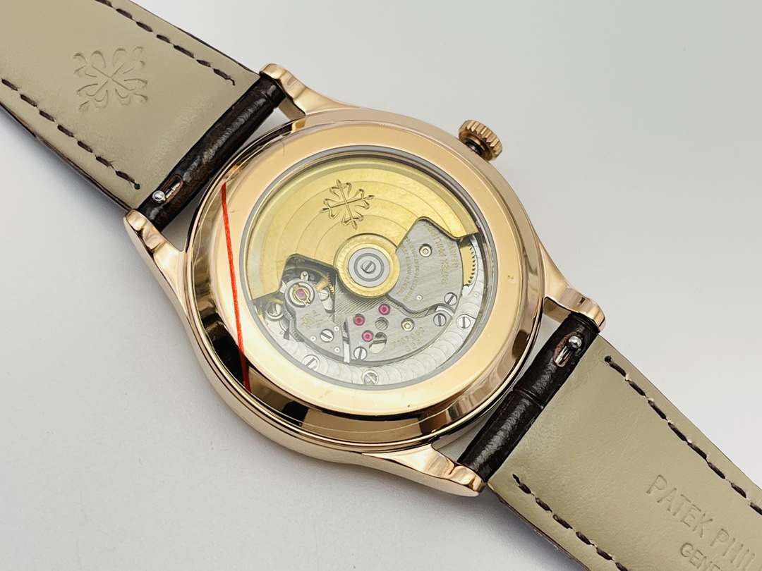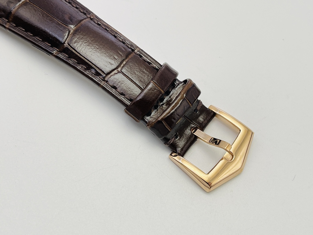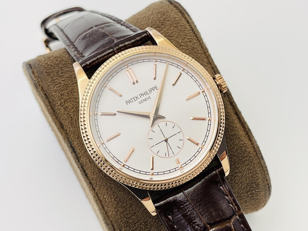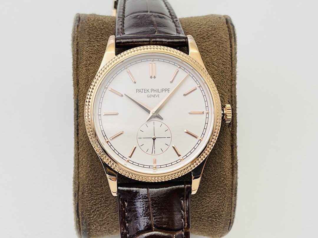 It features a 39mm 18K rose gold case, only 8.1mm thick, paired with a silver grained dial, exuding a warm and understated style. The round bezel is adorned with a hand-engraved Clous de Paris pattern, a classic design that first appeared in 1934, polished for a luxurious feel. The 18K rose gold faceted "bullet"-shaped hour markers are inspired by the most classic models in the Calatrava series. A double hour marker design at 12 o'clock, paired with 18K rose gold sword-shaped hour and minute hands, features finely faceted hands that shimmer captivatingly in the light. A small seconds subdial at 6 o'clock uses a four-part structure with black markers, simple yet practical. It comes standard with a gleaming chocolate brown alligator leather strap with an 18K rose gold pin buckle, echoing the case's color and offering both comfort and style.