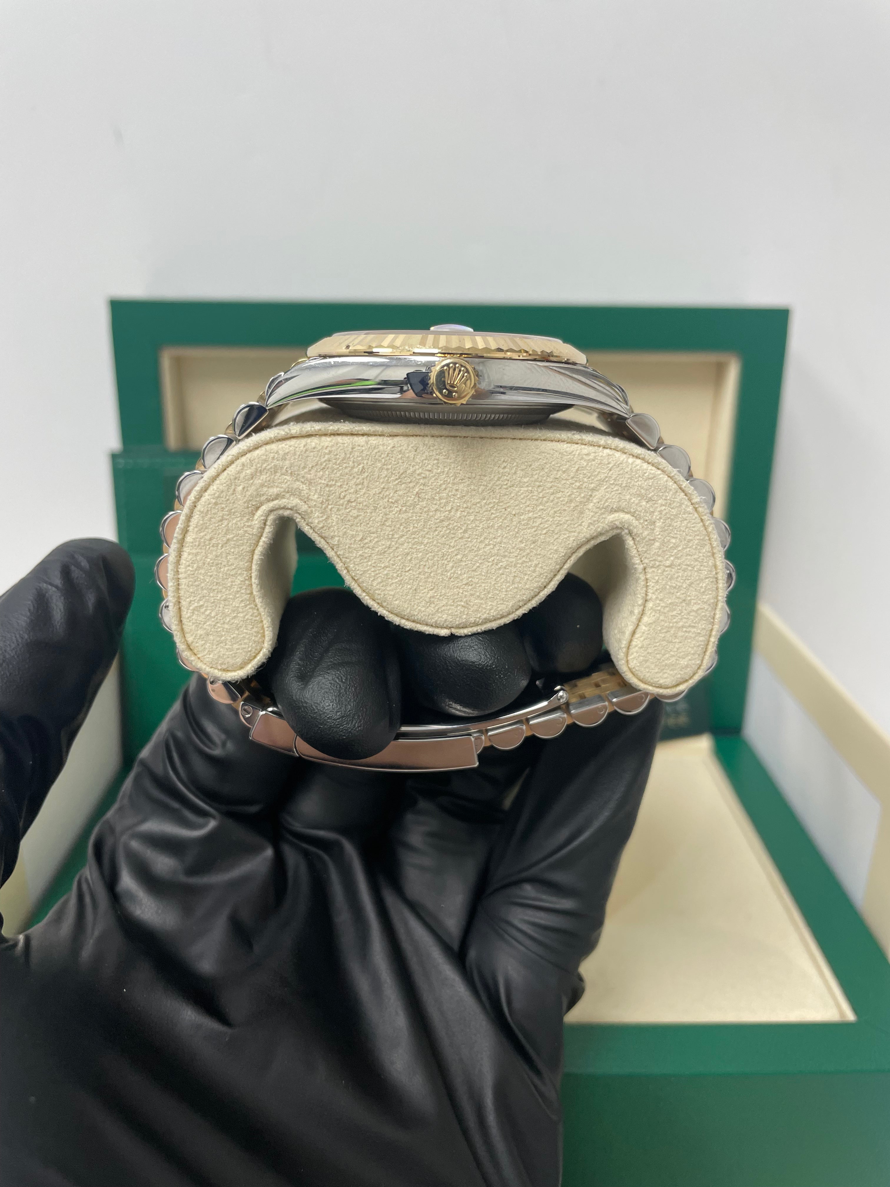 41mm Everose Rolesor case with 904L steel monobloc middle case, screw-down steel back, 18K Yellow Gold screw-down crown, 18K Yellow Gold fluted bezel, scratch-resistant double anti-reflective sapphire crystal with cyclops lens over the date, slate-gray dial, green Roman numerals. Rolex caliber 3235 perpetual self-winding movement with date at 3 o'clock that changes instantaneously at midnight in a few thousandths of a second, approximately 70 hours of power reserve, Everose Rolesor Jubilee bracelet made from a combination of 904L steel and 18K Yellow Gold with five-piece links, folding Oyster-Clasp buckle with Easylink 5mm comfort extension link. Water-resistant up to 100 meters.