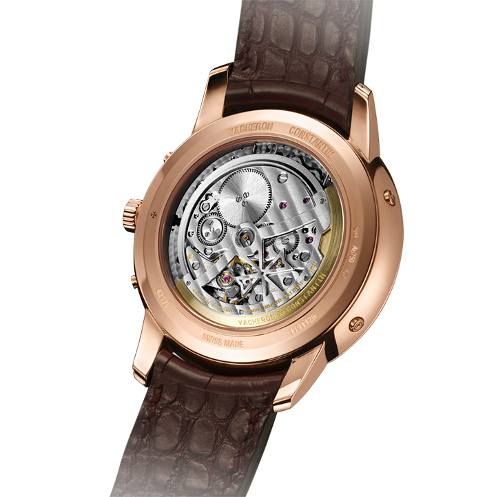 An elegant interpretation of the perpetual calendar, this 18K pink gold watch houses an ultra-slim automatic movement, just 4.05 millimeters thick, which will keep perfect time until 2100. The moon phase features a star-studded sky and two gold moons. Its openworked caseback reveals the exceptional hand-finished details of the self-winding mechanical movement.